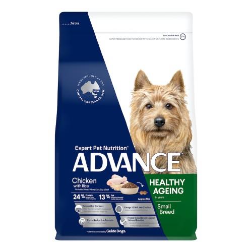 Every ingredient in Advance Adult Small Breed Healthy Ageing has been carefully selected by the Advance lab for the sole purpose of improving and supporting your mature dog’s health and total well-being. From the tips of his coat hairs to the innermost workings of his immune system, your pet’s needs are covered by Advance. Product details Chicken is the number 1 ingredient contains green lipped mussel powder which has been clinically proven to help manage joint health in dogs fortifies the immune system with scientifically proven levels of Vitamin E to help increase antioxident levels boosts healthy bacteria in the gut with the inclusion of beet pulp and inulin which act as natural prebiotics prevents build up of plaque and calcification and promotes good dental health.