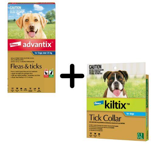 Tick ticks off bigtime with this double-whammy of tick treatments: a Kiltix dog collar plus Advantix for extra large dogs weighing over 25kg. Advantix hits fleas fast, killing adults and their larvae and breaking the flea life cycle to fight reinfestation. It also provides protection from ticks (including the deadly Australian paralysis ticks), mosquitoes and sandflies. A Kiltix dog collar repels and kills brown dog and bush ticks, as well as paralysis ticks. It remains effective for tick protection for six weeks, and fleas for five months. With Advantix and Kiltix, those little nasties don’t stand a chance. Product details Bundle includes adjustable Kiltix dog collar plus Advantix treatment package for extra large dogs weighing 25kg+ Kiltix dog collar provides protection from ticks for 6 weeks; protection from fleas for 5 months Advantix kills and repels ticks, kills fleas and flea larvae, and provides protection from sandflies and mosquitoes collar and treatment combination provides strong all-round protection for your dog.