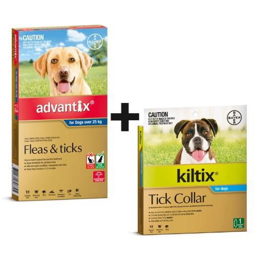 Tick ticks off bigtime with this double-whammy of tick treatments: a Kiltix dog collar plus Advantix for extra large dogs weighing over 25kg. Advantix hits fleas fast, killing adults and their larvae and breaking the flea life cycle to fight reinfestation. It also provides protection from ticks (including the deadly Australian paralysis ticks), mosquitoes and sandflies. A Kiltix dog collar repels and kills brown dog and bush ticks, as well as paralysis ticks. It remains effective for tick protection for six weeks, and fleas for five months. With Advantix and Kiltix, those little nasties don’t stand a chance. Product details Bundle includes adjustable Kiltix dog collar plus Advantix treatment package for extra large dogs weighing 25kg+ Kiltix dog collar provides protection from ticks for 6 weeks; protection from fleas for 5 months Advantix kills and repels ticks, kills fleas and flea larvae, and provides protection from sandflies and mosquitoes collar and treatment combination provides strong all-round protection for your dog.