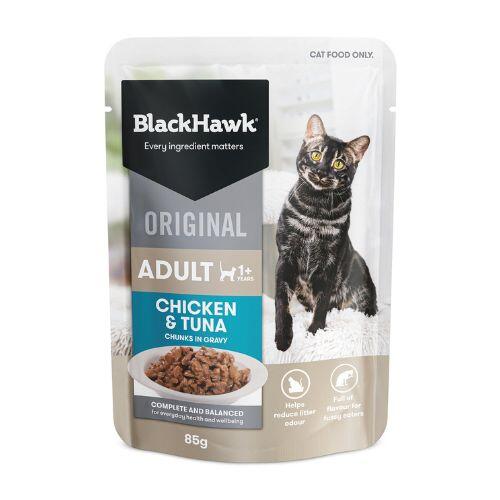 Black Hawk Adult Cat Chicken and Tuna in Gravy Pouches are specifically developed for cats, with proteins and textures they love, and the complete and balanced nutrition they need. Product details: Complete & balanced nutrition for adult cats real chicken and egg, packed with the amino acids essential for building strong bones and muscles' tuna rich in omega-3 fatty acids and protein, which support your cat's muscle and brain function with yucca extract also helps reduce litter odour no Added Artificial Colours, Flavours or Preservatives.