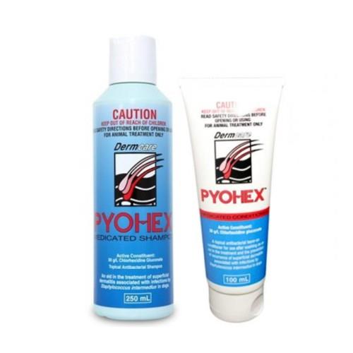 A discount Pyohex starter pack. Contains Pyohex Shampoo 250ml and 100ml Phohex Medicated Lotion. Pyohex Medicated Shampoo and Leave in lotion is a topical antibacterial shampoo to aid in the treatment of superficial dermatitis.Formulated to remove dirt and scale, degrease the skin and kill the cutaneous micro-organisms that primarily or secondarily cause dermatitis. Indications For primary or secondary pyoderma caused by bacteria adjunct to treatment for demodectic mange and other deep pyodermas preventative for recurrent pyodermas helps to remove dirt, scaly skin and grease whilst killing cutaneous micro-organisms does not irritate or dry like a chlorhexidine scrub does not dry or strip the coat of essential lipids needed to prevent transepidermal water loss, a process that promotes infection is pH neutral, specifically designed for canine skin does not irritate or dry like a Chlorhexidine scrub.