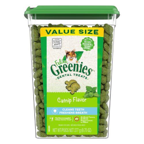 Greenies are the #1 vet recommended dental treat for cats. Now, more irresistible than ever in a delicious catnip flavour! Formulated with a unique shape and crunchy texture proven to reduce tartar and made from high quality, highly digestible ingredients. Product details Contain no artificial flavors or preservatives have only 1.25 calories per piece help your cat maintain optimum dental care and overall good health natural formula with added vitamins, minerals, taurine, and chlorophyll for optimum feline health.