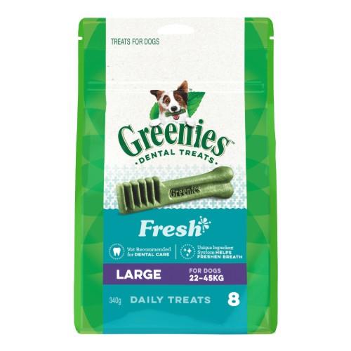 Greenies dental chews are like superheroes – they look and dress like a normal, everyday treat, but they’re actually packed with amazing super powers. Greenies is an all-natural treat for dogs that helps fight against dental disease. They’re hard enough to remove plaque buildup on teeth, but will not chip your dog’s teeth. They’re also proven to reduce bad breath and oral bacteria, improve digestion and provide good nutrition. The new enhanced recipe for Greenies is full of high-quality proteins, vitamins and minerals, and now also includes natural sources of antioxidants and fibre. They’re low in fat, nutritionally complete and well-balanced for effective dog maintenance. Your dog’s teeth will live to fight another day, thanks to Greenies dental chews. Product details 340g pack includes 8 dog treats large size is for dogs 22–45kg removes plaque and tartar reduces gingivitis freshens breath improves your dog’s overall health by reducing the risk of dental disease prevents formation of tartar through mechanical cleaning and by binding calcium.