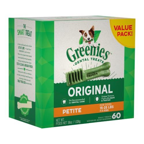 Greenies Original Dental Treats Petite are an all natural dental treat for dogs that helps fight against dental disease. Greenies are hard enough to remove plaque build-up from teeth, but will not chip the teeth of any dog. They are proven to reduce bad breath and plaque build-up, improve digestion, diminish oral bacteria and provide good nutrition. Product details Petite size is for dogs 7 -11kg. remove plaque and tartar – even heavy deposits contain natural sources of antioxidants and fiber are low in fat, nutritionally complete and well-balanced full of high-quality proteins, vitamins and minerals reduce gingivitis and freshens breath improves your dog’s overall health by deterring dental disease prevent tartar formation both by mechanical cleaning and by binding calcium contains chlorophyll, a natural deodoriser that freshens breath.