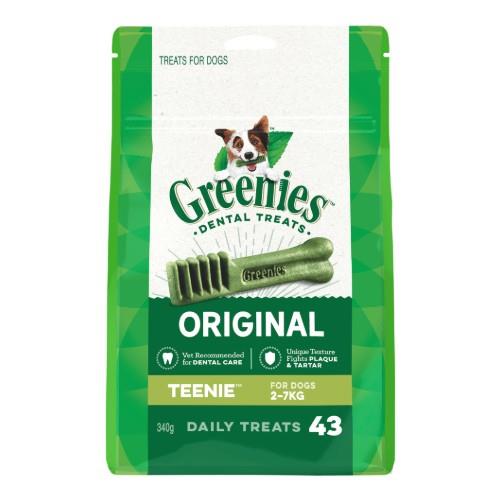 Greenies Original Dental Treats Teenie are an all natural dental treat for dogs that helps fight against dental disease. Greenies is an all natural dental treat for dogs that helps fight against dental disease. Greenies are hard enough to remove plaque build-up from teeth, but will not chip the teeth of any dog. They are proven to reduce bad breath and plaque build-up, improve digestion, diminish oral bacteria and provide good nutrition. The new enhanced recipe for Greenies dental chews is full of high-quality proteins, vitamins and minerals. Plus they now contain natural sources of antioxidants and fiber. Greenies dental chews are low in fat, nutritionally complete and well-balanced for effective adult dog maintenance. Product details Teenie size is for dogs 2 – 7kg. removes plaque and tartar – even heavy deposits reduces gingivitis and freshens breath improves your dog’s overall health by deterring dental disease prevents tartar formation both by mechanical cleaning and by binding calcium contains chlorophyll, a natural deodoriser that freshens breath.