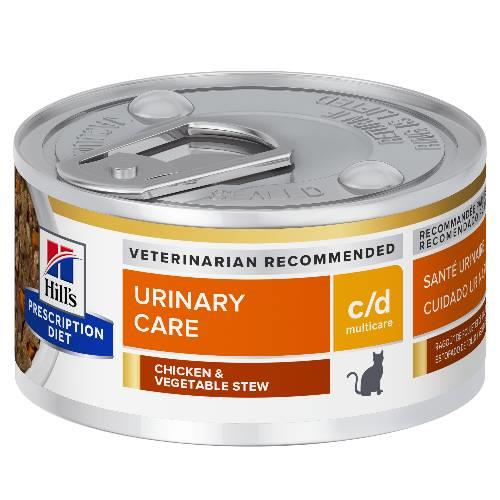 Hills Prescription Diet c/d Multicare Urinary Care Chicken Vegetable Stew Canned Cat Food has been designed to help keep your cat’s bladder healthy. Product deatils Designed to promote a healthy pH level in the urine helps to remove existing urinary stones and help control the formation of new stones and crystals helps to dissolve struvite stones in as little as 7 days (average 27 days) reduces the risk of struvite and calcium oxalate stones contains bite-sizes chunks of real chicken with natural ingredients.