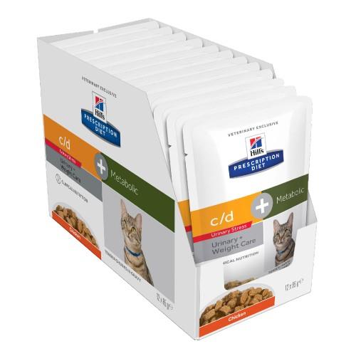 Hills Prescription Diet c/d Urinary Stress Plus Metabolic Cat Food Pouches have been formulated to support your cat’s nutritional needs during weight loss and management, while also improving their urinary health. Product details Recipe has been designed to work with your cat’s unique metabolism to promote weight loss and help them feel satisfied between meals suitable for cats with weight problems that also suffer from FLUTD controlled levels of magnesium, calcium and phosphorus help to promote a desirable pH level in the urine designed to naturally work with your cat’s metabolism helps to dissolves struvite stones in as little as 7 days helps your pet feel full and satisfied between meals.