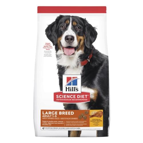 Hills Science Diet Adult Large Breed Chicken and Barley Dry Dog Food provides precisely balanced nutrition to maintain ideal body weight and healthy joints and to fuel the energy needs of large breed dogs during the prime of their life. Product details For large breed adult dogs 1-5 years of age with an ideal weight of 25-50kgs; and giant breeds 1-4 years of age with an ideal weight of 55kg+ made with high-quality, easy-to digest-ingredients supports the building of lean muscle with high-quality protein contains glucosamine and chondroitin for healthy joints and mobility. has a balanced blend of omega-6s and vitamin E to nourishe your dog's skin for a healthy, shiny coat.