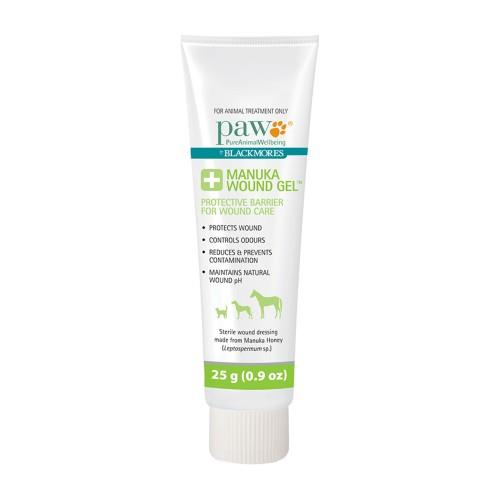 Paw Manuka Wound Gel is a sterile, medical grade wound dressing made from Leptospermum.sp (Manuka) honey (80%) and natural oils and waxes for wound management. Product details Ideal for dogs, cats, horses and other companion animals with wounds, burns, grazes and as a general first aid can be removed from the wound by rinsing with sterile saline or water at dressing change is a non-adherent gel that prevents contamination and infection directions for use: Wash around the wound with a sterile saline. Apply liberally (approx. 3mm layer) directly to the wound or to a suitable dressing. In addition using a barrier cream can further protect the wound margin. Dressing change frequency will depend on clinical circumstances. It can vary from once per day for draining wounds to up to 7 days for unsoiled dressings.