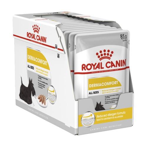 Royal Canin Dermacomfort Loaf Pouches are specifically formulated to soothe irritation and promote skin health in dogs prone to sensitive skin. Product details Nutritionally formulated with precise and high quality protein source to help support and nourish the skin suits dogs prone to skin irritation and itching low allergen formula that reduces the risk of triggering dietary allergies fortified with nutrients to support and nourish the natural barrier function of the skin ideal to mix with Royal Canin Dermancomfort dry dog foods for a variety in texture for adult dogs over 10 months of age.