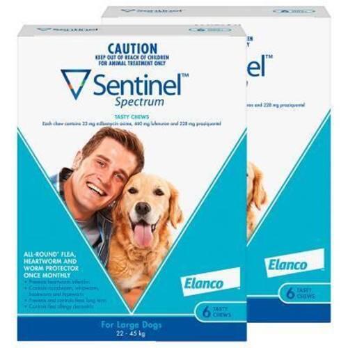 Unleash the army of good health on your dog with Sentinel Spectrum Chews, which provide month-long protection from fleas, heartworm, and intestinal parasites such as whipworm, tapeworm, roundworm and hookworm. Make sure you have your dog tested for heartworm before administering Sentinel. Product details For large-size dogs weighing 22-45kg provides protection from fleas, heartworm and intestinal parasites monthly dosage required tasty, chewable tablet see package for further instructions. PLEASE NOTE: This has been discontinued