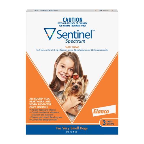 Not all soldiers wear camo gear and carry weapons…some soldiers take the form of small chewable tablets, like Sentinel Spectrum Chews. One of these tablets will keep your dog free from all sorts of invaders, such as heartworm, fleas, ringworm, hookworm, tapeworm and roundworm. Administer monthly for ongoing border protection. Product details tasty chews for very small dogs weighing up to 4kg thwarts heartworm infection prevents roundworm, whipworm, hookworm and tapeworm kills and controls fleas and flea allergy dermatitis coverage lasts 30 days see package for further dosage instructions